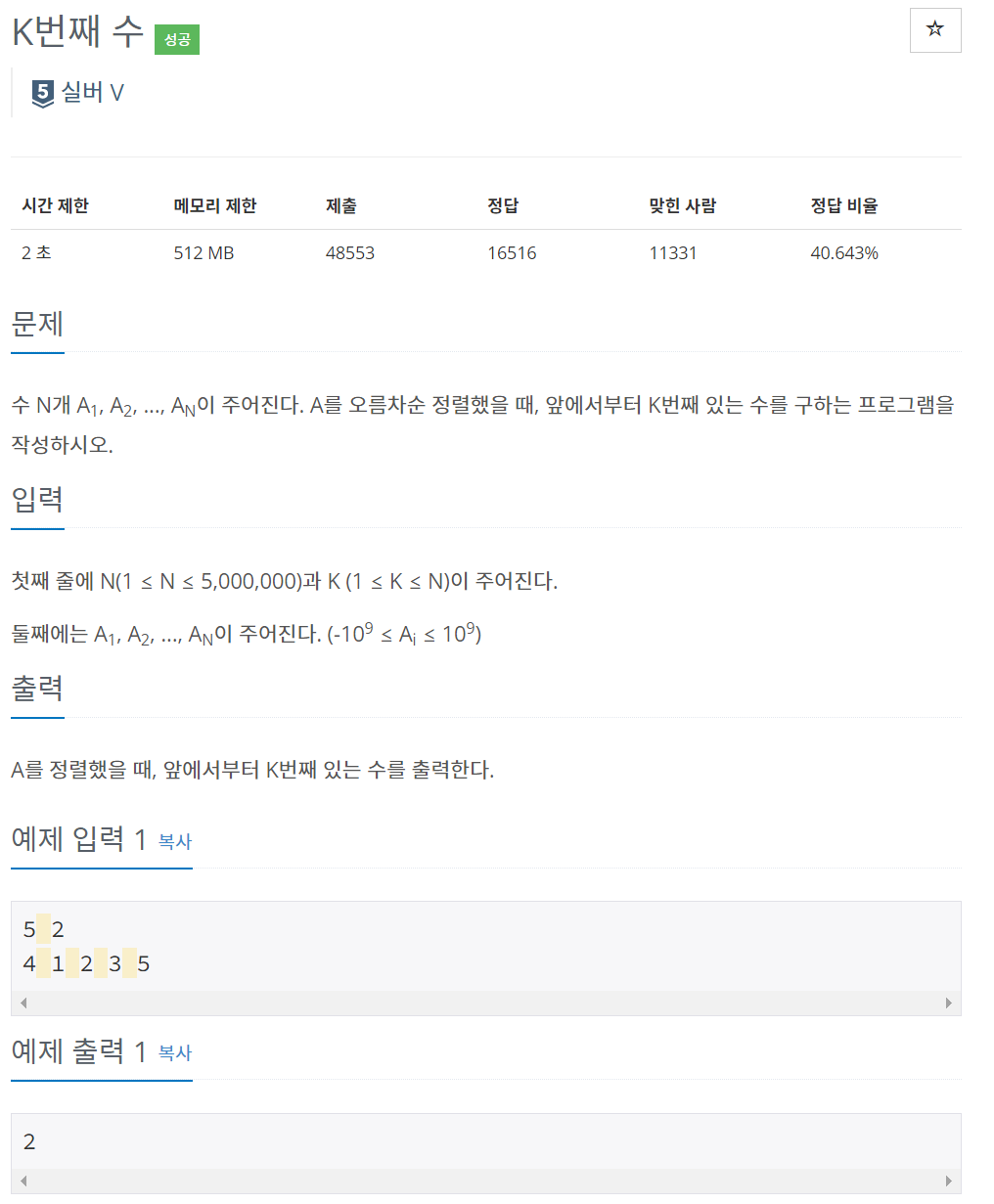 1 2 3 4 5 6 7 8 9 10 11 12 13 14 15 16 17 18 19 20 21 22 23 24 25 26 27 28 29 30 31 32 33 34 35 36 37 38 39 40 41 42 43 44 45 46 47 48 49 50 51 52 53 54 55 56 57 58 59 60 61 62 63 64 65 66 67 68 69 70 | public class Main{ // 이건 시간초과로 안됨 좌측피벗정렬임. public static void main(String[] args) throws IOException { BufferedReader br = new BufferedReader(new InputStreamReader(System.in)); //Scanner sc = new Scanner(System.in); StringTokenizer st = new StringTokenizer(br.readLine()); int n = Integer.parseInt(st.nextToken()); int k = Integer.parseInt(st.nextToken()); int[] a = new int[n]; st = new StringTokenizer(br.readLine()); for(int i = 0; i < n; i++){ a[i] = Integer.parseInt(st.nextToken()); } //구현부 quickSort sort = new quickSort(); sort.sort(a, 0, a.length-1); System.out.println(a[k-1]); // for (int num:a) { // System.out.println(num); // } } } class quickSort{ void sort(int[] a, int left, int right){ if(left >= right){ // 스택오버플로우방지 return ; } int pivot = partition(a, left, right); sort(a, left, pivot - 1); sort(a, pivot + 1, right); } int partition(int[] a, int left, int right){ int pivot = a[left]; int pivotIndex = left; while(left < right) { while (a[right] > pivot && left < right) { right--; } while (a[left] <= pivot && left < right) { left++; } swap(a, left, right); } swap(a, pivotIndex, left); return left; } void swap(int[] a, int i, int j){ int temp = a[i]; a[i] = a[j]; a[j] = temp; } } | cs |