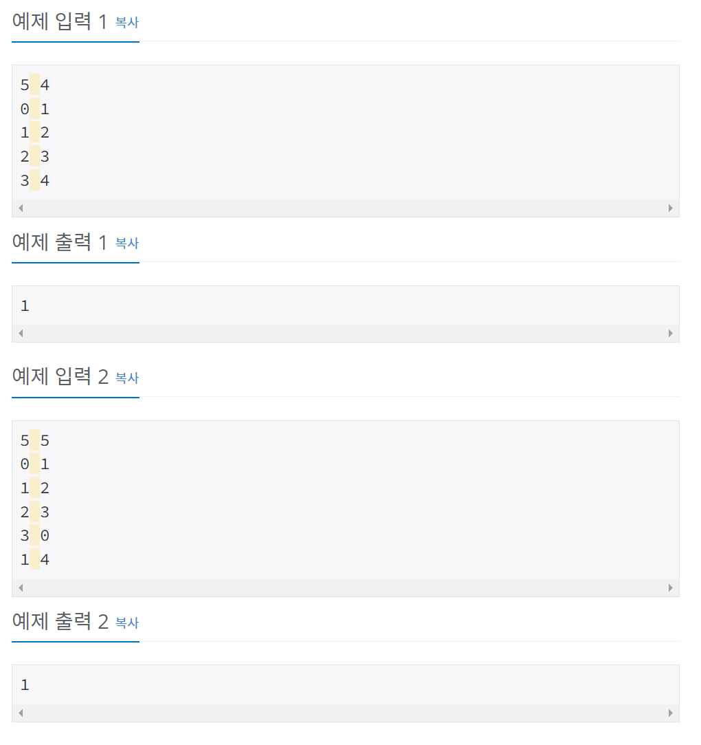 1 2 3 4 5 6 7 8 9 10 11 12 13 14 15 16 17 18 19 20 21 22 23 24 25 26 27 28 29 30 31 32 33 34 35 36 37 38 39 40 41 42 43 44 45 46 47 48 49 50 51 52 53 54 55 56 57 58 59 60 61 62 63 64 65 66 67 68 69 70 | package Baekjoon.gold; import java.io.BufferedReader; import java.io.IOException; import java.io.InputStreamReader; import java.util.ArrayList; import java.util.StringTokenizer; public class p13023 { static ArrayList<Integer>[] A; static boolean[] visited; static int isDepthFive = 0; public void main() throws IOException { // depth 5까지 들어가는지 확인하면됨 BufferedReader br = new BufferedReader(new InputStreamReader(System.in)); StringTokenizer st = new StringTokenizer(br.readLine()); int n = Integer.parseInt(st.nextToken()); int m = Integer.parseInt(st.nextToken()); int a, b; A = new ArrayList[n]; visited = new boolean[n]; for (int i = 0; i < n; i++) { A[i] = new ArrayList<Integer>(); } for (int i = 0; i < m; i++) { st = new StringTokenizer(br.readLine()); a = Integer.parseInt(st.nextToken()); b = Integer.parseInt(st.nextToken()); A[a].add(b); // 그래도 양방향은 달아야하나보네? A[b].add(a); } //구현부 for (int i = 0; i < n; i++) { DFS(i, 1); if (isDepthFive == 1) { break; } } System.out.println(isDepthFive); } static void DFS(int n, int depth) { if (depth == 5 || isDepthFive == 1) { isDepthFive = 1; return; } visited[n] = true; for (int i = 0; i < A[n].size(); i++) { if (!visited[A[n].get(i)]) { DFS(A[n].get(i), depth + 1); } } visited[n] = false; } } | cs |