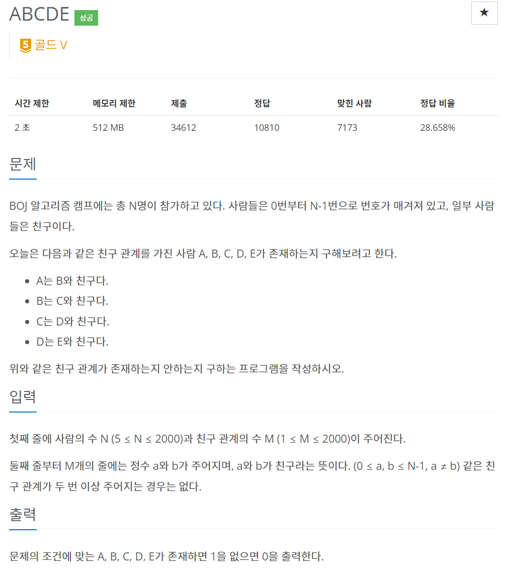 그냥 dfs구현하고 depth 1에서 5까지 쌓인다면 1을 출력하게 구현하면 됨