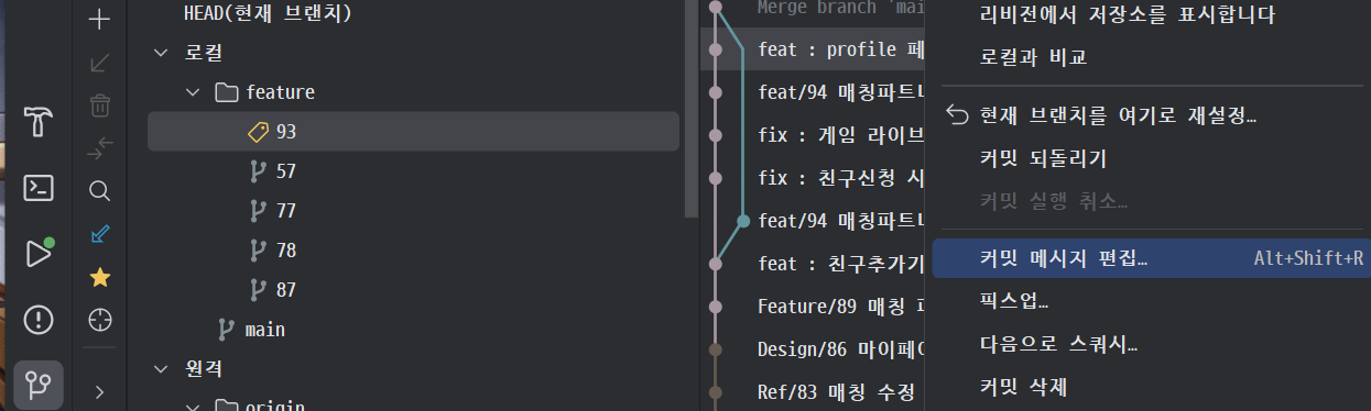 해당 커밋 메시지 우클릭 후 커밋 메시지 편집 버튼을 통해서 손쉽게 변경이 가능합니다..!