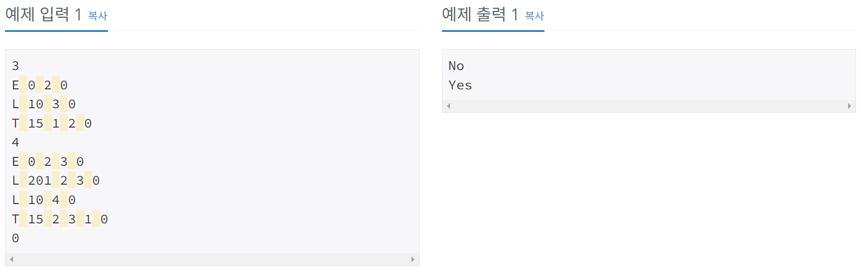 1 2 3 4 5 6 7 8 9 10 11 12 13 14 15 16 17 18 19 20 21 22 23 24 25 26 27 28 29 30 31 32 33 34 35 36 37 38 39 40 41 42 43 44 45 46 47 48 49 50 51 52 53 54 55 56 57 58 59 60 61 62 63 64 65 66 67 68 69 70 71 72 73 74 75 76 77 78 79 80 81 82 83 84 85 86 87 88 89 90 91 92 93 94 95 96 97 98 99 100 101 102 103 104 105 106 107 108 109 110 111 112 113 114 115 116 117 118 119 120 121 122 123 124 125 126 127 128 129 130 131 132 133 134 135 136 137 138 139 | package Baekjoon.gold; import java.io.*; import java.util.*; /** * 3 * E 0 2 0 * L 10 3 0 * T 15 1 2 0 * * E 빈방, L 레프리콘, T 트롤 * 두번째 0, 10, 15 금액 * 레프리콘은 10원 기준 * 트롤은 15원 기준 * * 1번방 출발 빈방시작 * 이후의 값은 다 다른 방과 이어지는 번호 * * 처음 모험가가 시작하는 방 번호 1 * * 연결리스트로 추가하기 * */ public class p2310 { static ArrayList<Room> mapList; static boolean[] visited; static int n; static StringBuilder sb = new StringBuilder(); static boolean flag; static boolean success; public static void main(String[] args) throws IOException{ BufferedReader br = new BufferedReader(new InputStreamReader(System.in)); n = Integer.parseInt(br.readLine()); while(n > 0){ mapList = new ArrayList<>(); visited = new boolean[n+1]; int myMoney = 0; flag = true; success = false; //0번방의 필요없는 데이터 주입 mapList.add(new Room(-1,"NOTHING",-1)); // for(int roomNumber = 1; roomNumber <= n; roomNumber++) { StringTokenizer st = new StringTokenizer(br.readLine()); Room roomInit = new Room( roomNumber, st.nextToken(), Integer.parseInt(st.nextToken()) ); int inputNum = Integer.parseInt(st.nextToken()); while(inputNum > 0){ roomInit.roomNumberAdd(inputNum); inputNum = Integer.parseInt(st.nextToken()); } mapList.add(roomInit); } dfs(1, myMoney); if(!success){ sb.append("No").append("\n"); }else{ sb.append("Yes").append("\n"); } n = Integer.parseInt(br.readLine()); } System.out.println(sb); } static void dfs(int roomNum, int myMoney){ if(success){ return; } visited[roomNum] = true; Room nowRoom = mapList.get(roomNum); myMoney = nowRoom.visitRoomEvent(myMoney); if(myMoney >= 0){ if(n == roomNum){ success = true; return; } for(int roomNumber : nowRoom.getLinkedRoomList()){ if(!visited[roomNumber]) { dfs(roomNumber, myMoney); } } }else{ visited[roomNum] = false; return; } } private static class Room{ int roomNum; String roomType; int roomMoney; final ArrayList<Integer> roomList; Room(int roomNumber, String type, int money){ this.roomMoney = money; this.roomNum = roomNumber; this.roomList = new ArrayList<>(); this.roomType = type; } void roomNumberAdd(int number){ roomList.add(number); } ArrayList<Integer> getLinkedRoomList(){ return roomList; } int visitRoomEvent(int money){ if(roomType.equals("L")){ if(money < this.roomMoney){ return this.roomMoney; } } if(roomType.equals("T")){ if(money < this.roomMoney){ return -1; } money -= roomMoney; return money; } return money; } } } | cs |