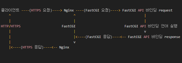 - Nginx에서 HTTPS요청이였다면 HTTP로 변환 후 FastCGI프로토콜로 다시 담아 FastCGI API를 지원하는 언어에 요청