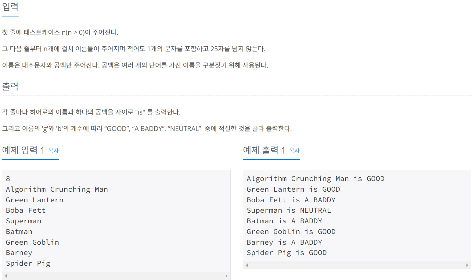 1 2 3 4 5 6 7 8 9 10 11 12 13 14 15 16 17 18 19 20 21 22 23 24 25 26 27 28 29 30 31 32 33 34 35 36 37 38 39 40 41 42 43 44 45 46 47 48 49 50 51 52 53 54 55 56 | import java.util.Scanner; public class Main { public static void main(String[] args) { int[] goodAndBad = new int[2]; // 0 = good, 1 = bad Scanner sc = new Scanner(System.in); int n; n = Integer.parseInt(sc.nextLine()); check c = new check(); String[] s = new String[n]; for(int i = 0; i < n; i++) { s[i] = sc.nextLine(); //nextInt()를 사용 시 s[0]에 '' 저장 주의 } for(int i = 0; i < n; i++) { goodAndBad[0] = 0; goodAndBad[1] = 0; for (int j = 0; j < s[i].length(); j++) { if((int)s[i].charAt(j) == 103) { // g == 103 , G == 71 goodAndBad[0]++; } else if((int)s[i].charAt(j) == 71) { goodAndBad[0]++; } else if((int)s[i].charAt(j) == 98) {// b == 98, B == 66 goodAndBad[1]++; } else if((int)s[i].charAt(j) == 66) { goodAndBad[1]++; } } s[i] = s[i].concat(c.goodOrBad(goodAndBad)); } for(int i = 0; i < n; i++) { System.out.println(s[i]); } } } class check { String goodOrBad(int[] a) { if(a[0] > a[1]) { return " is GOOD"; } else if(a[0] < a[1]) { return " is A BADDY"; } else if(a[0] == a[1]) { return " is NEUTRAL"; } return "error"; } } | cs |