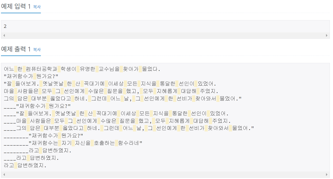 1 2 3 4 5 6 7 8 9 10 11 12 13 14 15 16 17 18 19 20 21 22 23 24 25 26 27 28 29 30 31 32 33 34 35 36 37 38 39 40 41 42 43 44 45 46 47 48 49 50 51 52 53 54 55 56 57 58 59 60 | import java.util.Scanner; public class Main { static int repeatn; public static void main(String[] args) { Scanner sc = new Scanner(System.in); int n = sc.nextInt(); System.out.println("어느 한 컴퓨터공학과 학생이 유명한 교수님을 찾아가 물었다."); repeatn = n; myrepeat(0, n); } public static void myrepeat(int num, int n) { String s = "____"; if(n >= 0) { for(int i = 0; i < num; i++) { System.out.print(s); } System.out.println("\"재귀함수가 뭔가요?\""); // s.repeat() 이건 자바11에서만사용 if(n != 0) { for(int i = 0; i < num; i++) { System.out.print(s); } System.out.println("\"잘 들어보게. 옛날옛날 한 산 꼭대기에 이세상 모든 지식을 통달한 선인이 있었어."); for(int i = 0; i < num; i++) { System.out.print(s); } System.out.println("마을 사람들은 모두 그 선인에게 수많은 질문을 했고, 모두 지혜롭게 대답해 주었지."); for(int i = 0; i < num; i++) { System.out.print(s); } System.out.println("그의 답은 대부분 옳았다고 하네. 그런데 어느 날, 그 선인에게 한 선비가 찾아와서 물었어.\""); } myrepeat(num+1,n-1); if(n == 0) { for(int i = 0; i < num; i++) { System.out.print(s); } System.out.println("\"재귀함수는 자기 자신을 호출하는 함수라네\""); } for(int i = 0; i < num; i++) { System.out.print(s); } if(num == 0) { System.out.println("라고 답변하였지."); }else { System.out.println("라고 답변하였지."); } } } } | cs |